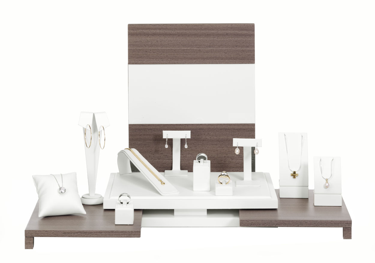 Das Display Set Pure besteht aus insgesamt 4 individuell kombinierbaren Elementen und besticht durch sein zeitlos klassiches Design. Die Displays sind aus hochwertigem und robustem MDF in Akazien-Optik gefertigt und teilweise mit weißem Soft-Lederimitat bezogen.