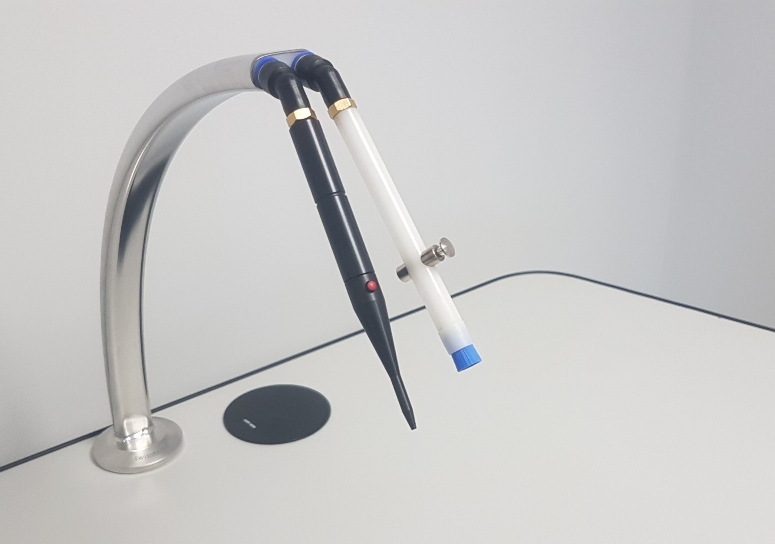 Druckluft/Vakuum-Verteiler aus poliertem Edelstahl auf Drehsockel, mit integriertem Rückholsystem inkl. einem