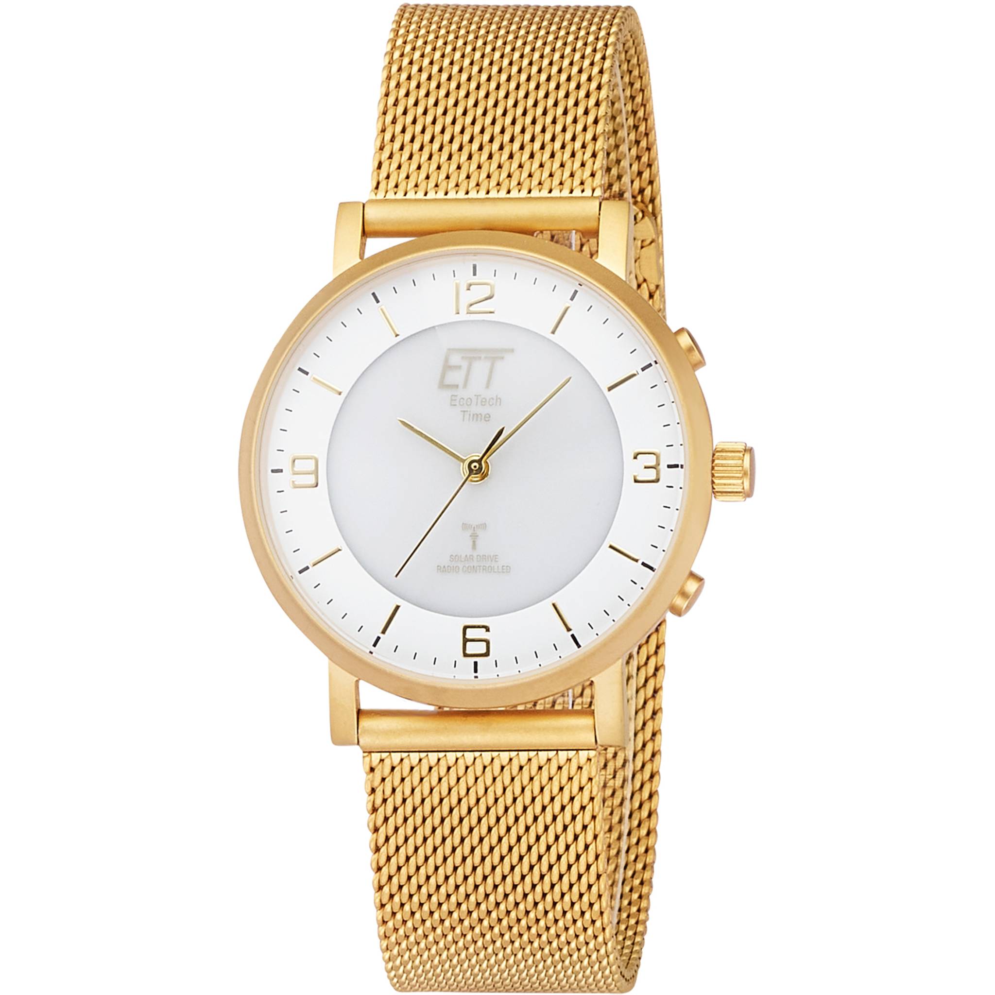 Eine besonders flache, elegante Damenuhr. Goldfarben mit einem weiß/hellgrauen Ziffernblatt und Solar-Funk-Antrieb. Die Eco Tech Time Solar Drive Atacama Damenuhr EGS-11472-11M hat 60-90 Tage Dunkelgangreserve. Automatische Umstellung von Sommer- und Winterzeit.