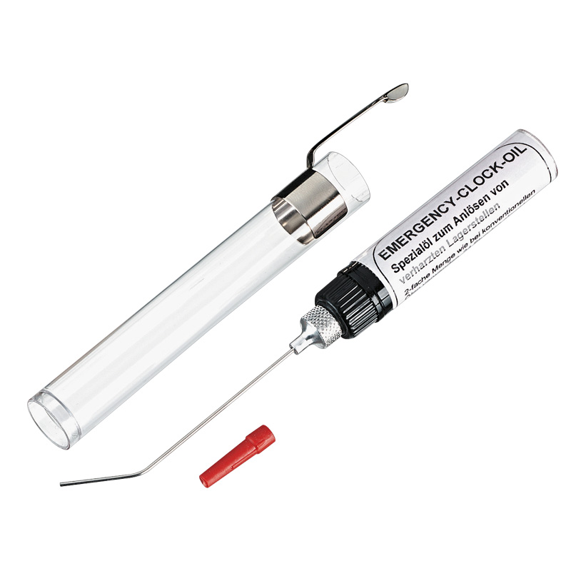 Spezialöl zum Anlösen verharzter Lagerstellen in Großuhrwerken. Mit sehr feiner Dosierkanüle. Inhalt 4 ml.