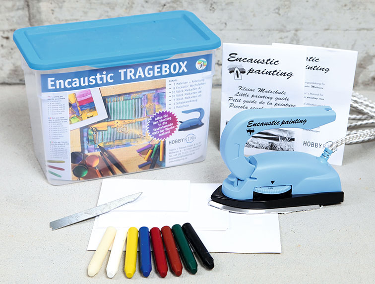 <br /><br />Mit unserem zusammengestellten Einsteiger-Set steigen Sie optimal vorbereitet in die Welt der Enkaustik ein, denn mit dem Komplettset in einer praktischen Klarsicht-Box sind alle wichtigen Artikel enthalten, die Sie zum Start benötigen.