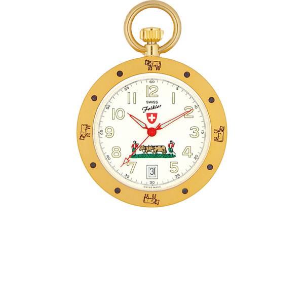 SWISS FOLKLOR® Taschenuhr – Schweizer Präzisions Quartzwerk- Zifferblatt (hellbeige) mit gelb aufgedruckten  Zahlen und Minuterie sowie schweizer  Logo und Sennen mit Kühen- Datumsanzeige 6h- Minuten- Stundenzeiger mit Leuchtmasse- roter Sekundenzeiger (ausgewuchtet) – Gehäuse Messing vergoldet- matte Lunette mit Indexpunkten und Kühen- Pressboden Edelstahl- Mineralglas (flach)- griffige Zylinderkrone- beweglicher Kettenhaltering Spritzwassergeschützt (nicht wasserfest!)Ø: 38 mm, h: 7 mm, ca. 31.5g, 2 Jahre GarantiePreis inkl. original KunstlederetuiePflegetipp:Taschenuhren bitte nicht schutzlos in der Hosentasche tragen. Schon winzigste Textilfasern können den feinen Werkmechanismus blockieren. Die Uhr am besten mit dem mitgeliferten Etuie schützen. Kleine Schweizer Trachtenuhr Ungetragene Taschenuhr mit Garantie vom Schweizer Uhrmacher. Die Uhr kann gerne vor einer Kaufentscheidung besichtigt, und auch vor Ort abgeholt werden. Portofreie Lieferung Swiss Ethno Design Schweizer Alpaufzug Als Alpaufzug oder Alpfahrt, Alpauffahrt wird das Bringen von Weidevieh auf Bergweiden, die sogenannten Almen bezeichnet. Es ist eine Form des Viehtriebs. Bis Mitte des 20. Jahrhunderts war der Almauftrieb mit manchmal mehrtägigen Fussmärschen für Vieh und Hirten verbunden. Dabei wurden den Kühen, je nach Gegend, grosse Glocken und Tricheln umgehängt. Im Gegensatz zum Alpabfahrt wurden die Tiere nicht festlich geschmückt. In der Ostschweiz entwickelte sich die als St. Galler Stickerei weltberühmte Trachtendekor. Diese wertvolle Handwerkskunst findet man noch heute auf vielen traditionellen und modernen Trachten für Damen und Herren.Hirten verbunden. Dabei wurden den Kühen, je nach Gegend, grosse Glocken und Tricheln umgehängt. Im Gegensatz zum Alpabfahrt wurden die Tiere nicht festlich geschmückt. In der Ostschweiz entwickelte sich die als St. Galler Stickerei weltberühmte Trachtendekor. Diese wertvolle Handwerkskunst findet man noch heute auf vielen traditionellen und modernen Trachten für Damen und Herren. Wir sind offizielle Konzessionäre. Sie können alle Modelle auch telefonisch bestellen. Gerne machen wir Ihnen ein Angebot! Wir empfehlen dazu eine Taschenuhrkette aus unserem Zubehör Angebot.