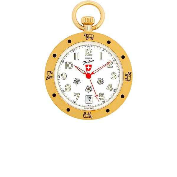 SWISS FOLKLOR® Taschenuhr – Schweizer Präzisions Quartzwerk- Zifferblatt (weiss) mit gelb aufgedruckten  Zahlen und Minuterie sowie Schweizer-  kreuz und 3 Edelweiss-Blumen- Datumsanzeige (6h)- Minuten- Stundenzeiger mit Leuchtmasse- roter Sekundenzeiger (ausgewuchtet) – Gehäuse Messing vergoldet- matte Lunette mit Indexpunkten und Kühen- Pressboden Edelstahl- Mineralglas (flach)- griffige Zylinderkrone- beweglicher Kettenhaltering Spritzwassergeschützt (nicht wasserfest!)Ø: 38 mm, h: 7 mm, ca. 31.5g, 2 Jahre Garantie Preis inkl. original Kunstlederetuie Pflegetipp:Taschenuhren bitte nicht schutzlos in der Hosentasche tragen. Schon winzigste Textilfasern können den feinen Werkmechanismus blockieren. Die Uhr am besten mit dem mitgeliferten Etuie schützen.. Kleine Schweizer Trachtenuhr Ungetragene Taschenuhr mit Garantie vom Schweizer Uhrmacher. Die Uhr kann gerne vor einer Kaufentscheidung besichtigt, und auch vor Ort abgeholt werden. Portofreie Lieferung Swiss Ethno Design Schweizer Alpaufzug Als Alpaufzug oder Alpfahrt, Alpauffahrt wird das Bringen von Weidevieh auf Bergweiden, die sogenannten Almen bezeichnet. Es ist eine Form des Viehtriebs. Bis Mitte des 20. Jahrhunderts war der Almauftrieb mit manchmal mehrtägigen Fussmärschen für Vieh und Hirten verbunden. Dabei wurden den Kühen, je nach Gegend, grosse Glocken und Tricheln umgehängt. Im Gegensatz zum Alpabfahrt wurden die Tiere nicht festlich geschmückt. In der Ostschweiz entwickelte sich die als St. Galler Stickerei weltberühmte Trachtendekor. Diese wertvolle Handwerkskunst findet man noch heute auf vielen traditionellen und modernen Trachten für Damen und Herren. Wir sind offizielle Konzessionäre. Sie können alle Modelle auch telefonisch bestellen. Gerne machen wir Ihnen ein Angebot! Wir empfehlen dazu eine Taschenuhrkette aus unserem Zubehör Angebot.