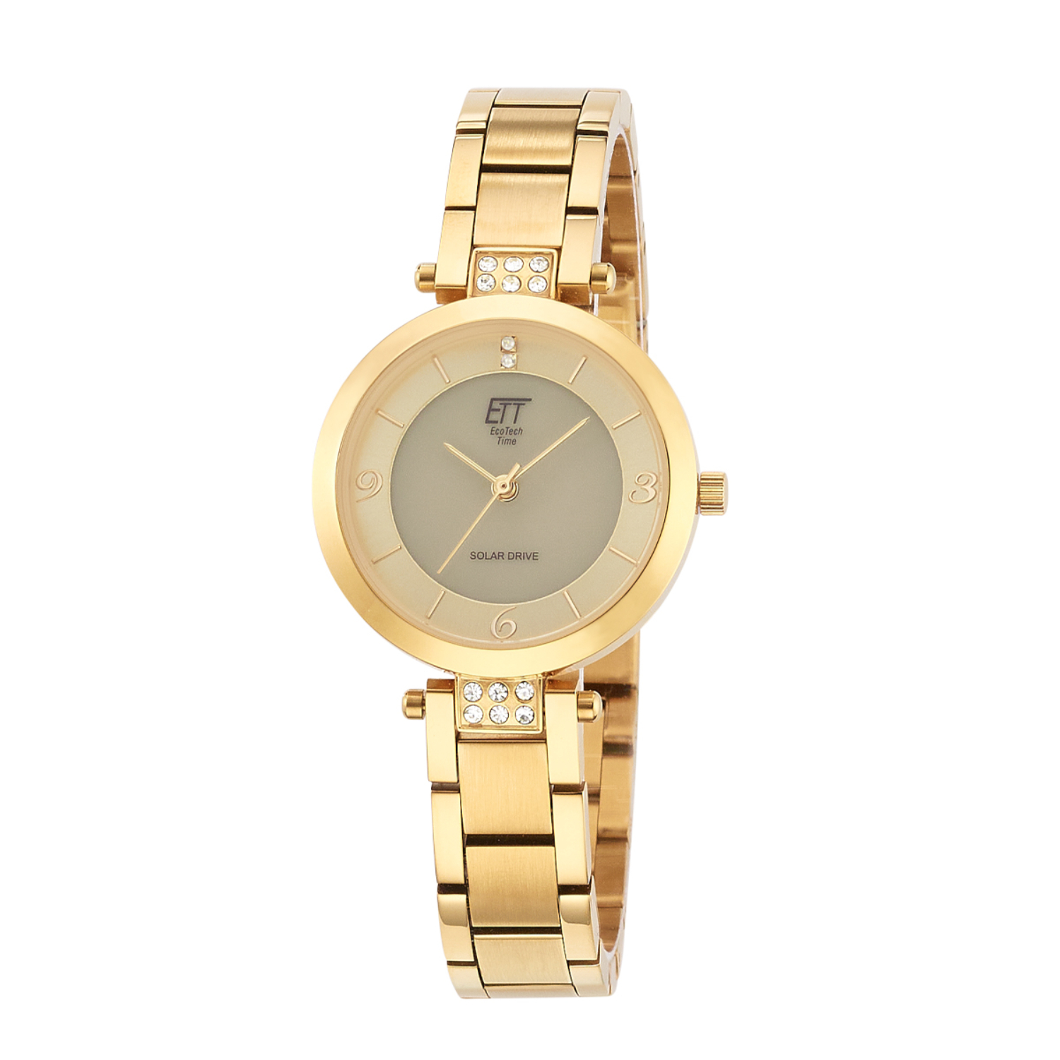 Diese elegante Damen Solar Uhr ist komplett im goldfarbenen Design gehalten. Zwei echte Diamanten schmücken das ebenfalls goldfarbene Zifferblatt. Auf dem schmalen Gliederarmband befinden sich zudem einige funkelnde Schmucksteine. Das Gehäuse ist bis 5 Bar wasserdicht.
