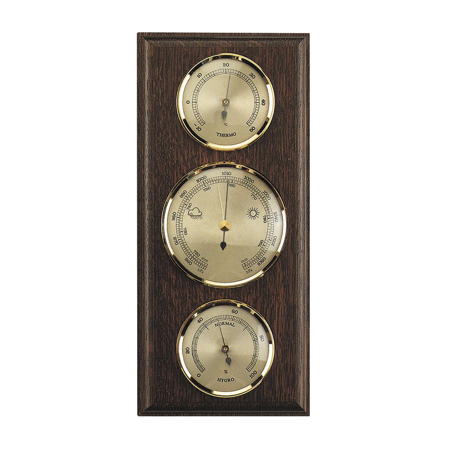 <br /><br />Wetterstation mit Barometer (geschlossen), Thermometer und Hygrometer (Bi-Metall), hergestellt aus massiver Eiche (dunkel) und Messingringen in Unterfranken.