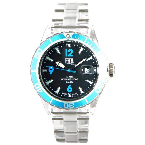 Die Unisex Kunststoffuhr mit pinkem Silikonband passt zu allem und ist das Must-have der Schweizer Marke aus Basel. Fun Watches für Sport, im Alltach oder einfach als Accessoire mit Fun-Faktor: Swiss Fun Armbanduhren – Schweizer Quartzwerk (Cal. Ronda 505, Lausen) – Zifferblatt (schwarz) – aufgedruckten Klassikzahlen (blau)   und weisse Minuterie – Indexeinteilung mit Leuchtmasse  – grosse Superluminova Leuchtzeiger (silber) – Sekundenzeiger (blau) – Kunststoffgehäuse (weiss transparent) – Alulunette (türkis) mit 60er Einteilung – Edelstahl-Pressboden – kratzgeschütztes Mineralglas (mit Lupe bei 3h) – Polycarbonat-Gliederarmband (weiss transparent) – Faltschliesse wassergeschützt (5 ATM) Ø: 43 mm, h: 11 mm, ca. 40g 2 Jahre Garantie Preis inkl. Box FHB Uhren aus Basel Wieder entdecktes modernes ethno Design vom Schweizer Uhrenexperten Felix Huber aus Basel. Sein Design überzeugt durch klassische Linienführung mit modischen Akzenten. Wir sind seit 50 Jahren FHB Uhren Fachhändler. Passen Sie die FHB Funuhren dank einer bunten Vielfalt an Ziffernblättern und Armbändern Ihren Lifestyle an. W I C H T I GBei der Bestellung bitte die gewünschte Bandlänge angeben!
