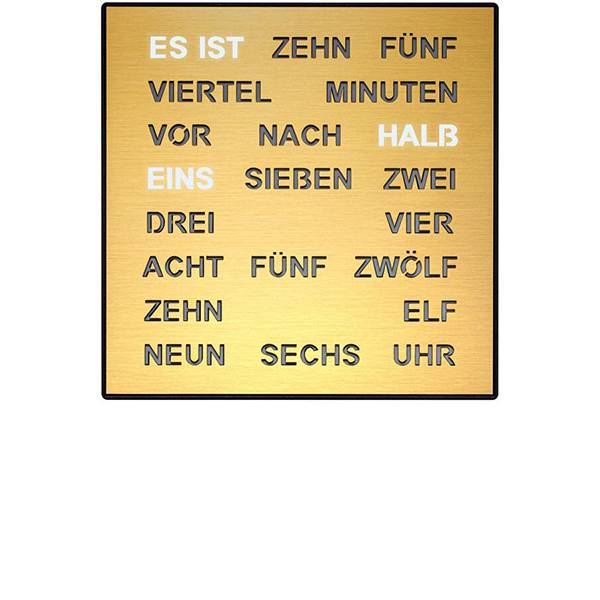 Die Wörter der Uhrzeit werden auf dem matt goldenenen weiss erleuchtet. Das macht sie zu einem Hingucker in jeder Wohnung. Die Tisch- oder Wanduhr wird nicht mit einer Batterie sondern durch ein Netzteil angetrieben. Wort Tischuhr – Wortuhr zum Hinstellen oder Aufhängen – geräuschloser Quartz Uhrwerk- Display aus vergoldetem Messing (matt)- weisse LED Zeitanzeige (in Worten)- schwarzes Duroplastgehäuse- schwarzes Netzkabel (ca 1.5m) Staubgeschützt Nur für den Innengebrauch!b: 28 cm, h: 28cm, t: 4 cm2 Jahre GarantiePreis inkl. Kartonbox, Gebrauchsanweisung, Kabel, 12 Volt Netzteil, VRG Original Uhren mit Garantie vom Schweizer Uhrmacher Das goldfarbene Zifferblatt harmoniert perfekt mit dem Gehäuse aus hochwertigem Acrylglas und verleiht der Uhr eine zeitlose, edle Optik. Die Tischuhr lässt sich wie ein Fotorahmen aufstellen und wird inklusive Netzteil geliefert. Sie kann gerne vor einer Kaufentscheidung besichtigt, und auch vor Ort in Basel abgeholt werden. Portofreier Versand! Filius Zeitdesign Von Carl Filius in Berlin gegründet und nun in der 4. Generation in Familienbesitz, steht die Deutsche Firma seit 1896 Filius Zeitdesign für preiswertes und zeitlos schönes Design Made in Germany. Das Motto von Filius Zeitdesign lautet: “Zeitloses zum fairen Preis”. #Tischuhr ohne Zeiger und Zahlen