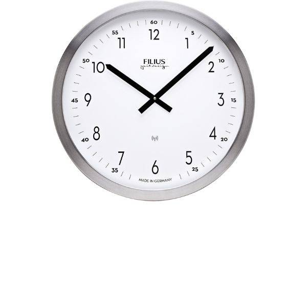 Die Wohnraumuhren von Filius Zeitdesign sind hochwertig verarbeitet, leicht ablesbar und äusserst ganggenau. XL Bauhaus Funk Wanduhr – Funkgesteuertes Uhrwerk (UTS Germany – CE-zertifiert!)- kontrasstarkes Zifferblatt (weiss)- schlichte Klassikzahlen (schwarz)- aufgedruckte Minuterie- schwarze Stabzeiger (kein Sekundenzeiger!)- hellgraues Aluminium-Gehäuse- echtes Mineralglas (flach) Nur für den Innengebrauch Ø: 40 cm, h: 5 cm, ca. 700g 2 Jahre Garantie Preis inkl. Kartonbox, 1 Batterie (LR6/AA, 1.5V), VRG UTS Funkwerk Die Zeit wird durch ein präzisions Funkwerk von UTS (Uhren Technik Schwarzwald) angezeigt. Die U.T.S. Präzisionstechnik GmbH produziert seit 1980 hochwertige und preiswerte Präzsionsprodukte Made in Germany. Funkuhr Automatische Zeiteinstellung, automatische Umstellung auf Sommer- und Winterzeit, Zeitzonen-Einstellung möglich. Der Sender des DCF77-Zeitsignals der Cäsium-Atomzeitbasis mit der genauesten Uhr der Welt (Abweisung 1 Sekunde in ca. 2’000’000 Jahren) befindet sich bei Frankfurt a.M. Dessen Funksignale können in Europa in einem Radius von ca. 1’500 km empfangen werden. Befindet sich die Wanduhr ausserhalb dieses Funksignals, läuft er quarzgenau weiter. Keine manuelle Einstellung möglich. Filius Zeitdesign Wanduhr aus Aluminium Von Carl Filius in Berlin gegründet und nun in der 4. Generation in Familienbesitz, steht die Deutsche Firma seit 1896 Filius Zeitdesign für preiswertes und zeitlos schönes Design Made in Germany. Das Motto von Filius Zeitdesign lautet: “Zeitloses zum fairen Preis”. Mehr bestellen – weniger bezahlen! ab 3 Stück 10% Rabatt Für Firmen und öffentliche Einrichtungen bieten wir » Spezialkonditionen. Gerne beraten wir Sie bei der Wahl der Uhr. Rufen Sie einfach unsere Hotline an. Weitere Infos über Büro Wanduhren » im Blog Wir sind offizielle Filius Konzessionäre. Gerne machen wir Ihnen ein Angebot für andere Modelle!