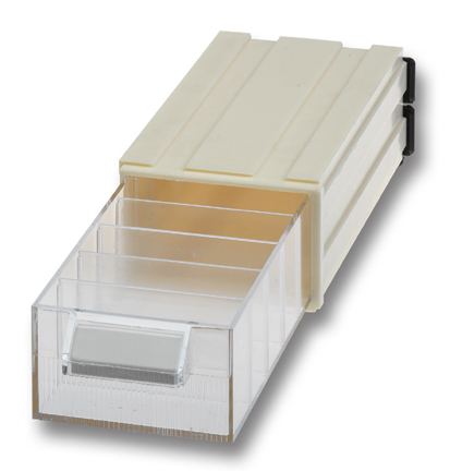 Aus Kunststoff mit glasklaren Schubladen und Griffleisten, für die Lagerung von Ersatzteilen, Kleinteilen, Werkzeugen und Bedarfsartikeln. Kennzeichnung der Schubladen durch Etikettenhalter in der Griffleiste. Die Flume-Boxen 2/1 – 2/2 2/3 und 4/1 können in beliebiger Kombination durch das CLAC-System ohne Verwendung von Werkzeugen miteinander verbunden – zusammengesteckt werden.