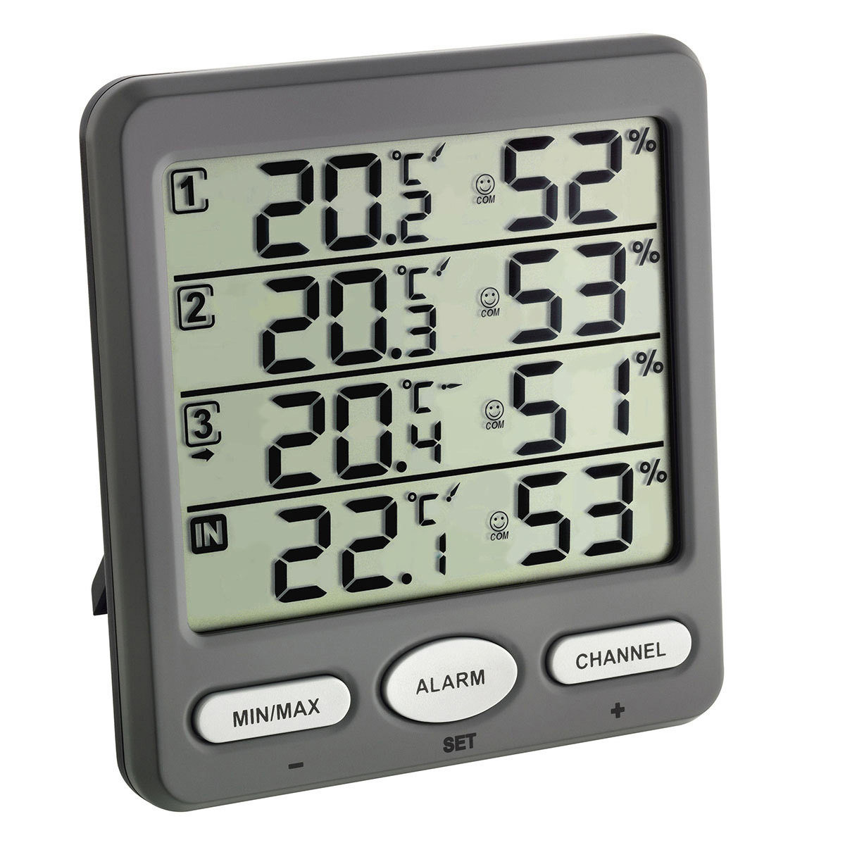 <br /><br />Für alle Messpunkte sind Alarmwerte einstellbar. Ein Komfort-Indikator gibt an, ob die Werte aktuell zu trocken, zu feucht oder im optimalen Bereich liegen. Durch gezieltes Heizen und Lüften schaffen Sie sich ein angenehmes und gesundes Wohnklima und sparen sogar Heizkosten.
