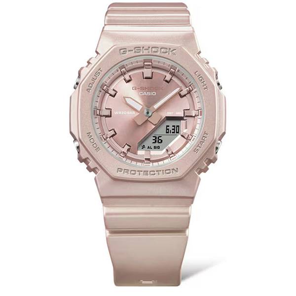 G-SHOCK Classic Silk: Die GMA-P2100ST hat eine perlmuttartige, polarisierte Beschichtung mit matter Oberfläche. Die rosa Metallic-Farbe des Zifferblatts verleiht der Uhr ein schlichtes, minimalistisches Design. Die wichtigsten Komponenten der Lünette und des Armbandes bestehen aus biobasiertem Resin. Dieses Material wird unter Verwendung erneuerbarer organischer Ressourcen produziert und soll dazu beitragen, die Umwelt zu schonen. Casio G-Shock medium Uhren – Digital-Analog Manufaktur Quartzwerk (Cal. 5611)- rosa Leuchtzeiger – Stoppuhr (1/1000s, 24h) – 5 unabhängige Alarme – Schlummerfunktion (Snooze)- Countown Timer (1/1 Min. – 24 h, mit autom. Wiederholfunktion) – Weltzeitanzeige (29 Zeitzonen) – Automatischer Kalender – 12-/24 Stunden-Format – Batterieende-Anzeige – LED Hintergrund-Beleuchtung (Licht) – Bio-Kunststoffgehäuse (dezentes rosa) – geschützte und korrosionsarme Kunststoffdrücker – Edelstahlboden (verschraubt) – kratzgeschütztes Mineralglas (flach) – Bio-Resinband (dezentes rosa) – Materialien erfahrungsgemäss antiallergisch Hohe Stossfestigkeit: Schutz bei Aufprall und Erschütterungen. Automatischer Kalender, unterschiedliche Monatslängen (28, 30 oder 31 Tage) werden automatisch berücksichtigt. Funktionssicher bei Temperaturen von -10C bis +60C 20 ATM wasserdicht (nach DIN) somit auch zum Tauchen geeignet 46 x 40 mm, h: 11.2 mm, ca. 40g 2 Jahre Garantie Preis inkl. original Box, Gebrauchsanweisung mit Produkteinfos 5 Tagesalarme: An täglich wiederkehrende Ereignisse erinnert der Tagesalarm, bei dem ein akustisches Signal zum eingestellten Zeitpunkt ertönt. Dieses Modell verfügt über fünf unabhängige Alarme – besonders praktisch zur täglichen Einnahme von Medikamenten oder zum Einhalten regelmässiger Termine. Neue Uhr mit Garantie des Herstellers. Die Uhr kann gerne vor einer Kaufentscheidung besichtigt, und auch vor Ort in Basel abgeholt werden. Portofreie Lieferung ⌚ OFFIZIELLE VERTRETUNG Wir verkaufen seit über 50 Jahren Uhren und sind ein zertifizierter Trusted Shop Als autorisierter Schweizer Fachhändler der Marke G-SHOCK profitieren Sie auch online von den entscheidenden Vorteilen hinsichtlich der Echtheit, den Garantieleistungen und des Nachverkaufsservice beim Online-Kauf. Wir führen in unserem Uhren Fachgeschäft in Basel noch weitere digitale Herrenuhren an Lager. Auch bei UHREN-SHOP.ch finden Sie noch mehr Casio Modelle. Einfach auf das Logo klicken »