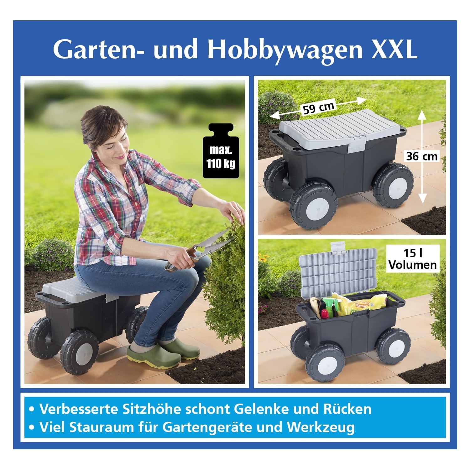 <br /><br />Der solide Garten- und Hobbywagen XXL (Belastbarkeit 110 kg) mit extrem robusten und belastbaren Kunststoffreifen ist DIE Lösung: einfach die benötigten Gartengeräte in den 15 l fassenden Behälter packen, auf der großen Sitzfläche platznehmen und bequem die Beete und Wege entlangrollen. Die komfortable Sitzhöhe (36 cm) ermöglicht ermüdungsfreies Arbeiten nicht nur im Garten, sondern auch im Haus und in der Werkstatt.