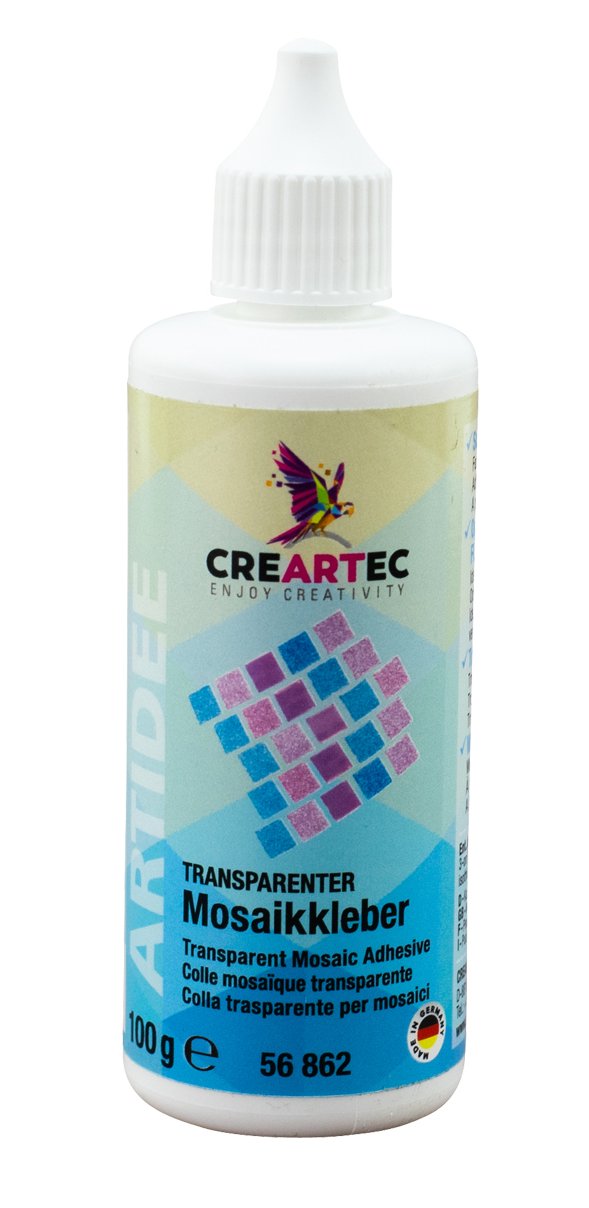 <br /><br />Mit diesem transparenten Kleber werden Mosaiksteine aus Glas, Keramik, Stein und Kunststoff schnell und sicher auf alle harten, nicht saugfähigen Untergründe, z.B. Glas, lackierte Holzflächen, Kunststoff, Metall, Keramik und Porzellan aufgeklebt. Bedingt durch die Adhesionskraft des Klebers können damit auch senkrecht stehende Glasteile schnell und sicher mit Mosaiksteinen belegt und so verklebt werden, dass sie nach dem festen Aufdrücken der punktuell auf die Mosaiksteine aufgebrachten Klebeflüssigkeit nicht abrutschen. Diese Klebetechnik ist sehr sparsam, da dafür nur eine geringe Klebermenge benötigt wird und sie gleichzeitig für eine grossartige Anhaftung auf dem Glasuntergrund sorgt.