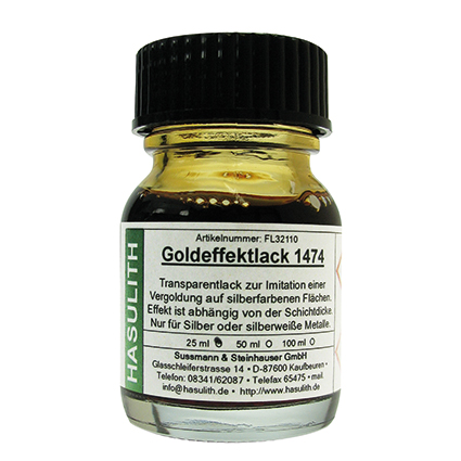 Der Gold-Effekt-Lack ist ein gelblich, bräunlicher, einkompontiger Transparentlack auf Lösungsmittelbasis zur Erzeugung eines Goldeffekts auf silberfarbenem Untergrund. Er zeichnet sich aus durch hohen Glanz, rasche Trocknung und gute Kratzfestigkeit. Er trocknet rein physikalisch unter Verdnstung der Lösungsmittel, dass heißt, der Lack kann – falls notwendig – nach der Trocknung mit einer geeigneten Verdünnung wieder abgewischt werden.