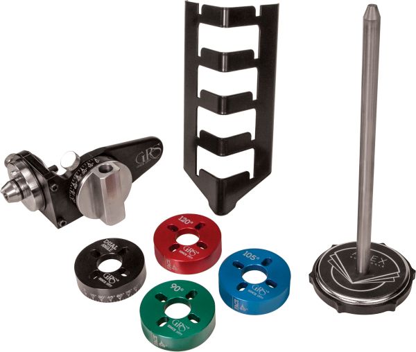 <br />Lieferumfang: 90°-Scheibe, 105°-Scheibe, 120°-Scheibe, Zweiwinkel-Gradwählscheibe, Apex-Haltestange und Aufbewahrungsgestell.