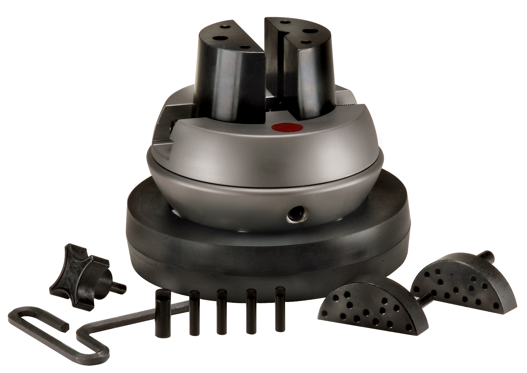 <br />Mitgeliefert werden die Halteplatten für die oberen Klemmbacken, 5 Stifte, das Kugelkissen, ein Sechskant- sowie ein Spannschlüssel.