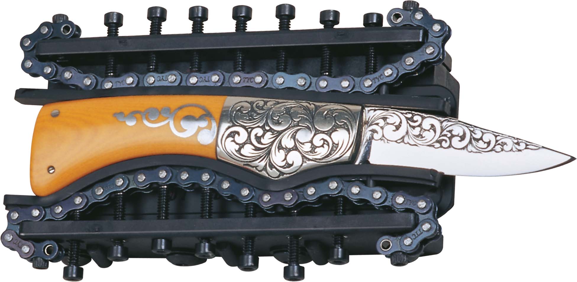 Von einem Graveur und Messermacher entwickelt und hergestellt, hält diese Halterung ein Messer in wenigen Sekunden so fest, dass Gravuren und andere Feinarbeiten sicher durchgeführt werden können. Spezielle, linear geformte Kettenhaltebacken passen sich problemlos an ungewöhnliche und komplexe Formen an. Mit der speziellen Hartgummibeschichtung greifen die Haltebacken sicher und ohne grosse Spannkräfte. Der Messerkontur-Klemmsatz lässt sich für verschiedenste Messer mit unterschiedlichen Dicken und Breiten anpassen und kann ebenso leicht in die meisten Gravierkugeln eingesetzt werden.