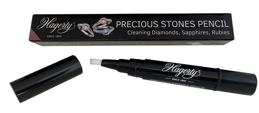 Einfach zu verwendender Stift mit Pinsel, mit welchem punktgenau Reinigungsflüssigkeit auf Diamanten, Sapphire und Rubine, sowie Gold und Platin aufgetragen wird.