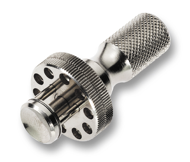 2 runde vernickelte Klemmplatten mit 10 Bohrungen von Ø 0,5 bis 3,2 mm. Durch Knopfdruck federn die Platten auseinander, dann kann der eingeklemmte Zeiger festgeschraubt werden.