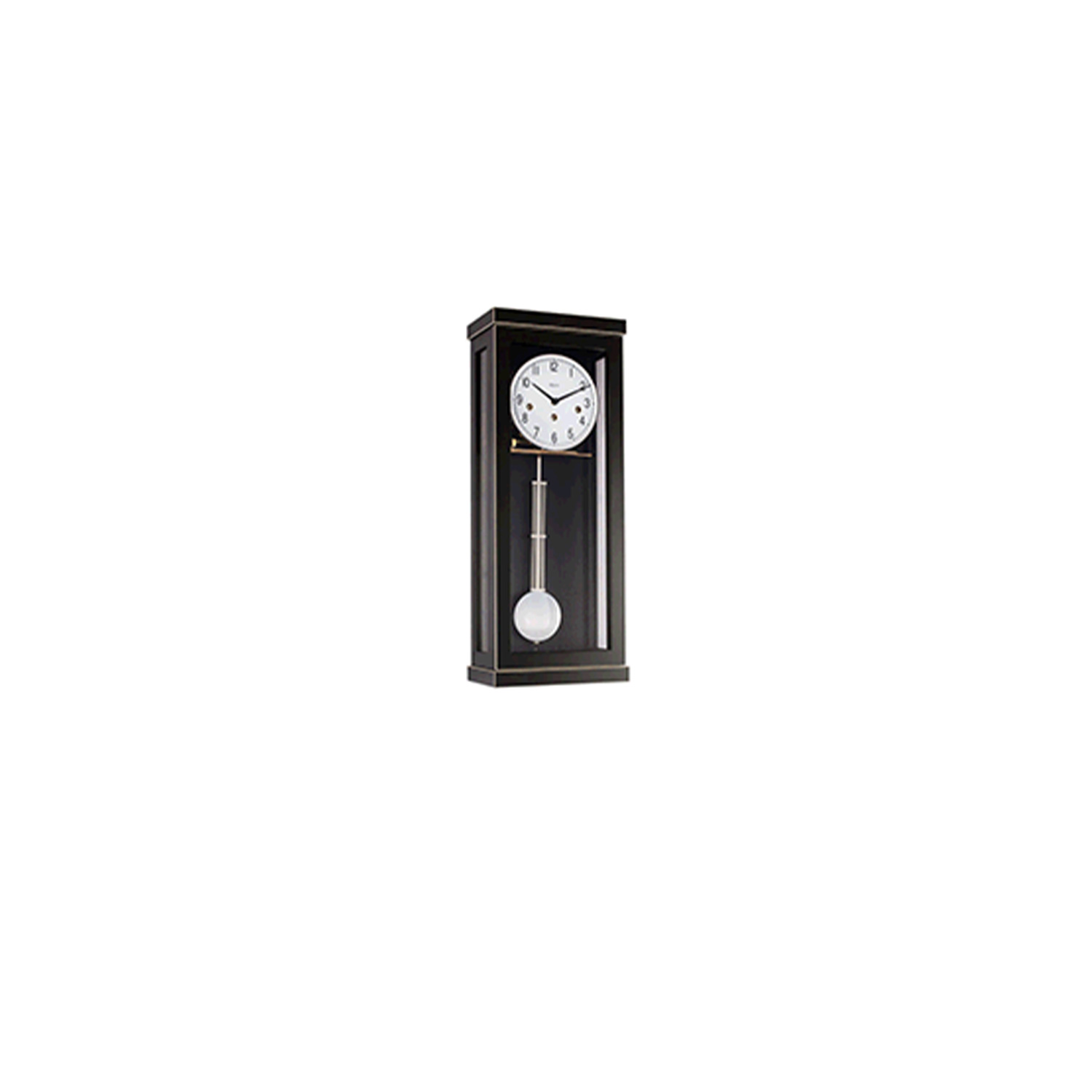 Avantgardistischer Regulateur, mit farbdifferenziert abgefaster Kante. Exklusives Massivholzgehäuse, mit Front- und Seitenverglasung, Gitterpendelausführung, Zifferblatt bedruckt.