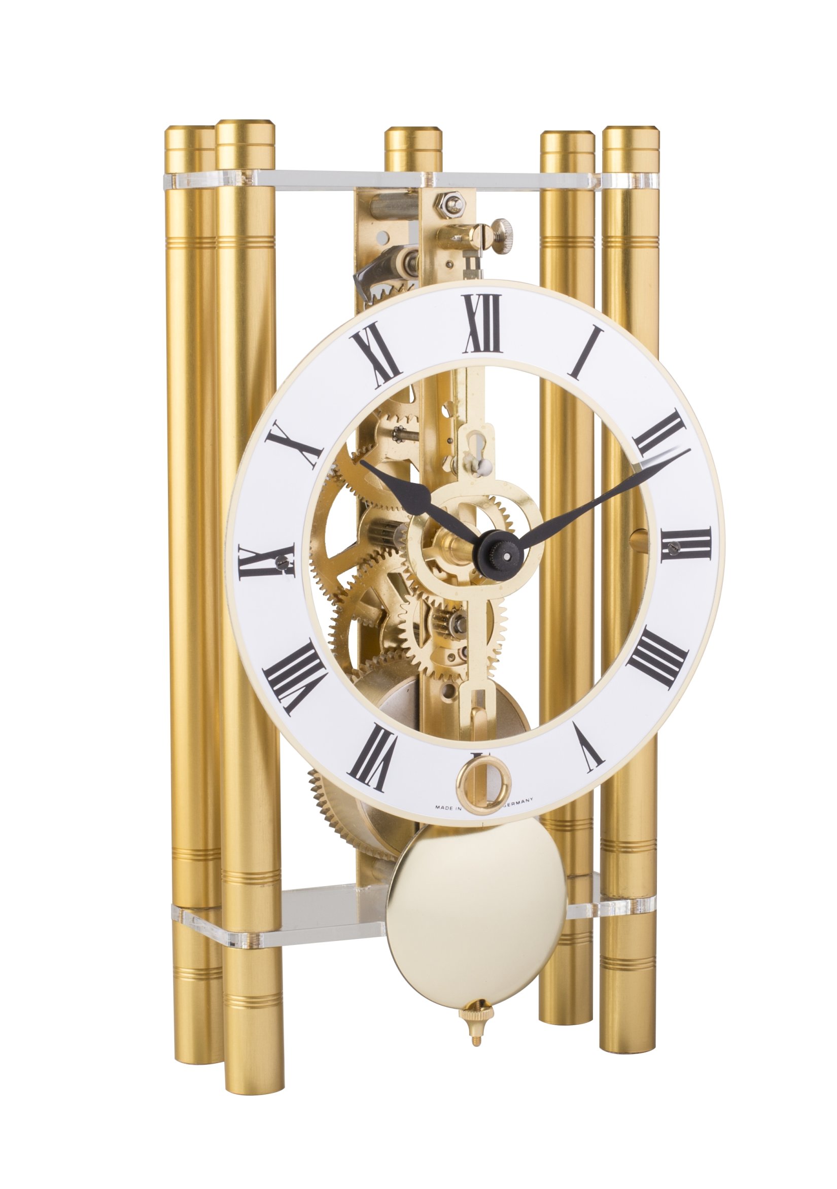 <br /><br />Puristische Design-Tischuhr mit eloxierten Aluminiumsäulen und 8-Tage-Skelettuhrwerk. Maße: 19,5 x 11 x 6cm. Made in Germany.