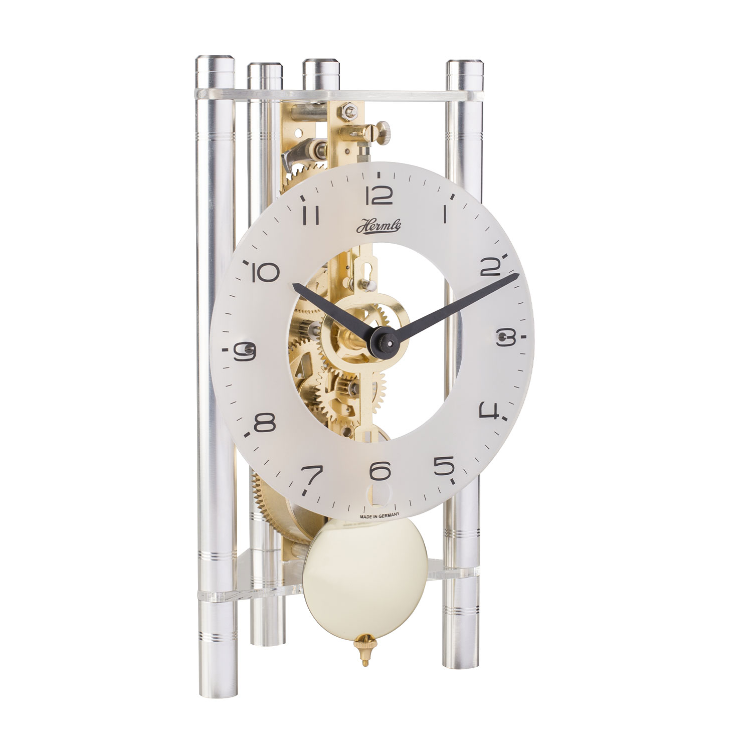 Hermle Tischuhr Alu silber/ gold, 8-Tage Skelettwerk, arabische Ziffern