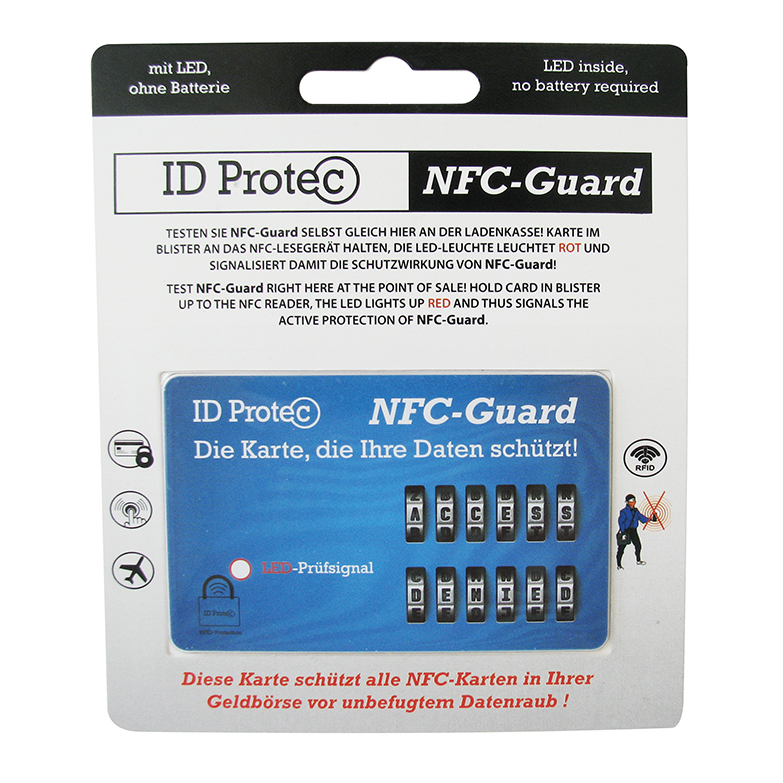 <br /><br />Einfach genial: Die Karte kreiert ein elektronisches Schutzfeld, wenn sie in die Nähe eines Lesegerätes kommt. Dieses lässt das LED-Prüfsignal blinken, der sichtbare Nachweis, dass der Schutz wirkt! Einfach in Ihre Geldbörse zwischen den Kreditkarten stecken – und schon sind Ihre wertvollen Daten sicher und können nicht unbemerkt ausgelesen werden. Wirksamer RFID-Schutz für alle Bezahlkarten, NFC-Kreditkarten, ePerso-Ausweise u.a.