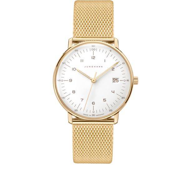 Junghans MAX BILL 33 Quartzuhr, vergoldet weiss Zahlen Mesh