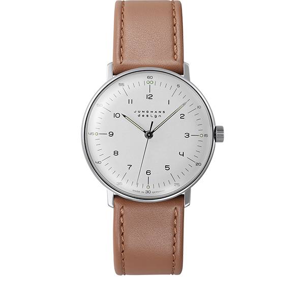 Junghans MAX BILL 34 Handaufzuguhr, Stahl weiss Zahlen Leder beige