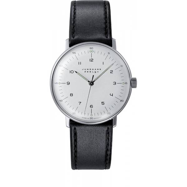 Junghans MAX BILL 34 Handaufzuguhr, Stahl weiss Zahlen Leder schwarz