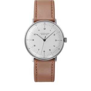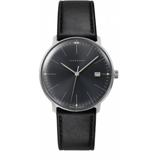 Die Armbanduhren, die Max Bill 1961 für Junghans entwarf, wird heute noch nahezu unverändert hergestellt. Vom puristischen Zifferblatt mit den eigens dafür entworfenen klar gerundeten Ziffern bis zum gewölbten Glas, das den historischen Charme der Uhr unterstreicht. Original Junghans Max Bill Quartz Uhren – Schweizer Präzisions Quartzwerk (Cal. J645.33, Basis ETA 955.112) – schwarzes Zifferblatt mit Sonnenschliff – aufgedruckte Minuterie und Leuchtinexpunkten (3,6,9,12) – weisse Datumsanzeige (3h) – polierte Fadenzeiger (mit umweltfreundlicher Leuchtmasse) – Zentrumssekunde (ausgewuchtet) – Flaches Edelstahlgehäuse poliert – verschraubter Edelstahlboden (mit Max Bill Logo) – beidseitig entspiegeltes Saphirglas (gewölbt) – schwarzes Rindsleder (abgesteppt) – einfache Edelstahl-Dornschiesse – Materialien erfahrungsgemäss antiallergisch Design nach Max Bill Zeitkonzept: Der Stundenzeiger berührt die innere Stundenindikation und der Minuten- und Sekundenzeiger die Aussen liegende Minuterie. Saphirglas:König unter den Uhrgläsern. Das hochwertigste Glas für Uhrengläser. Die Härte (2100 Vickers) und Kratzfestigkeit wird lediglich vom Diamanten übertroffen wassergeschützt (nach DIN) (nicht zum Schwimmen geeignet) Ø: 38 mm, h: 7.9 mm, ca. 40g 2 Jahre Garantie Preis inkl. original Max Bill Box, Gebrauchsanweisung mit Produkteinfo Original Junghans Uhren vom Schweizer Uhrmacher Neue Uhren mit internationaler Garantie des Herstellers. Wir sind seit über 20 Jahren autorisierter JUNGHANS Sternpartner. Die Uhr kann gerne vor einer Kaufentscheidung besichtigt, und auch vor Ort in Basel abgeholt werden. Portofreier Versand!