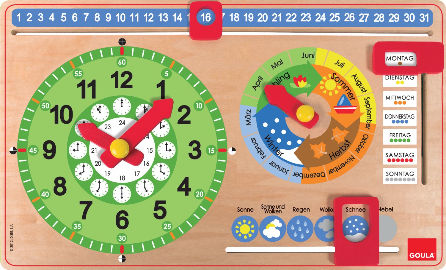Die Kalenderuhr in einem handlichen Format! Mit Monaten, Jahreszeiten, Wetter, Tagen, Stunden und Minuten. Mit Schiebern für Tage und Wetter sowie beweglichen Zeigern für die Uhrzeiten, Jahreszeiten und Monate. Spielend lernen Kinder den Umgang mit Monaten, Jahreszeiten, Wetter, Tagen, Stunden und Minuten. Die eingebauten beweglichen Teile können nicht verloren gehen und sind genau auf die Handhabung der Kleinen ausgelegt.