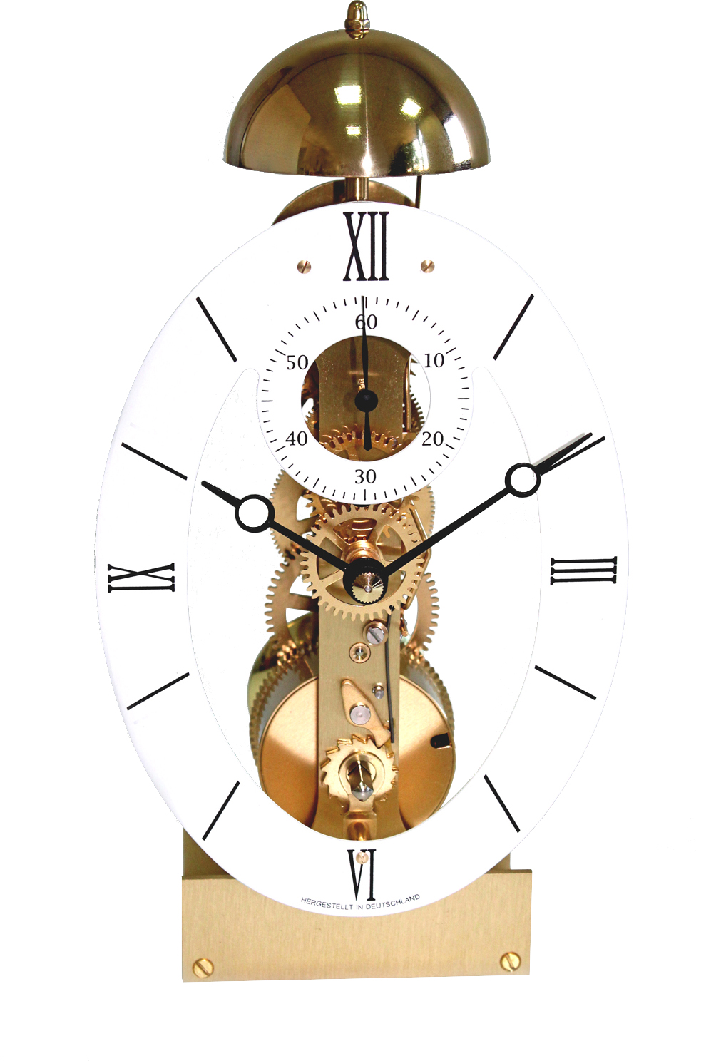 <br />Federzug-Stabwerk mit Passing Strike (Einzelschlag) auf Glocke zur Stunde, Palettenanker mit ruhender Hemmung (Graham) und Ankerautomatik, Sekundenanzeige, Zeigerwerklänge 27,8mm, Ovalzifferblatt 168/120mm weiß/römisch, schwarzer Zeigermutter, Brequet-Zeigern , Pfeilern (3x), komplett montiert. Maße: 168 x 120mm