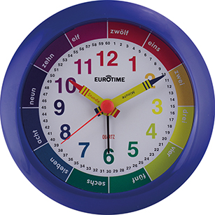 Kinderquarzwecker zum Erlernen der Uhrzeit, mit Lernzeigern, Sekunden- und Minuteneinteilung, großen Ziffern, mit Alarmfunktion. Maße: 100 x 100 x 30mm.