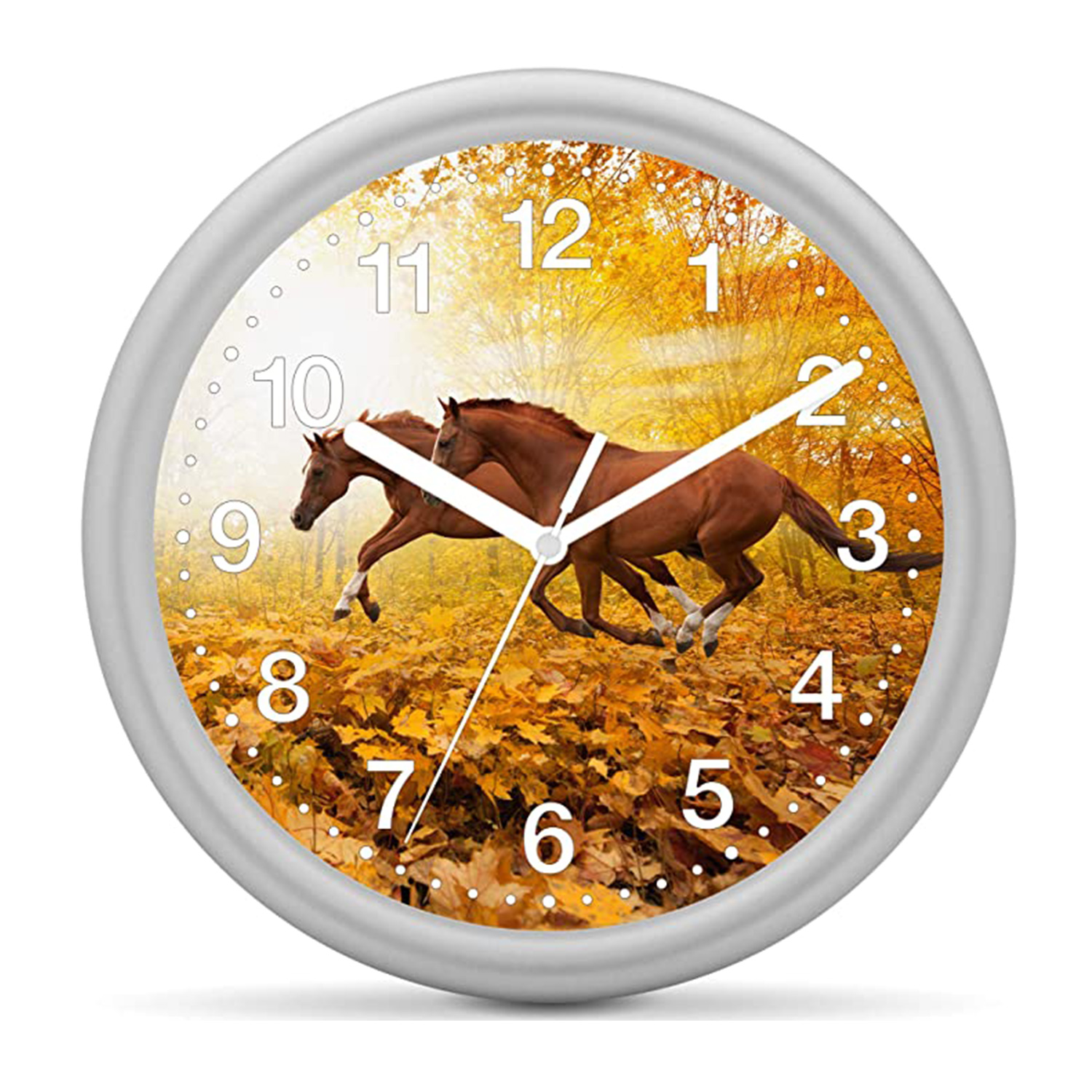 <br />Das mit Pferde-Motiven sowie großen arabischen Ziffern versehene Zifferblatt zeugt von einer kindgerechten Optik – eine schwebende Sekunde verhindert ein unliebsames Tick-Tack und ermöglicht den Kleinsten somit einen ungestörten Schlaf. Ausgestattet ist die Wanduhr mit einem zuverlässigen Quarzwerk.
