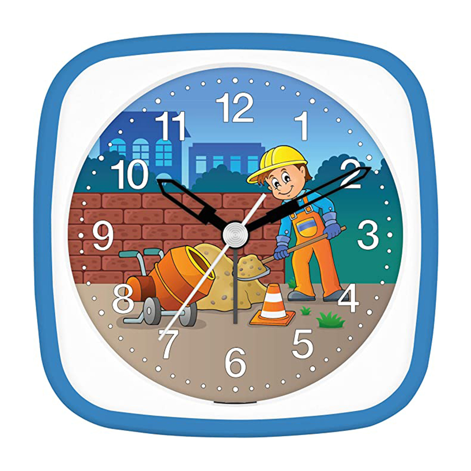 FÜR DIE KLEINSTEN BAUARBEITER: Der Bauarbeiter-Betonmischer-Wecker besticht durch ein Zusammenspiel aus Motiv und Gehäuse. Die blaue Farbgebung des Motivhintergrunds spiegelt sich im Rahmen des Artikels prägnant wider.