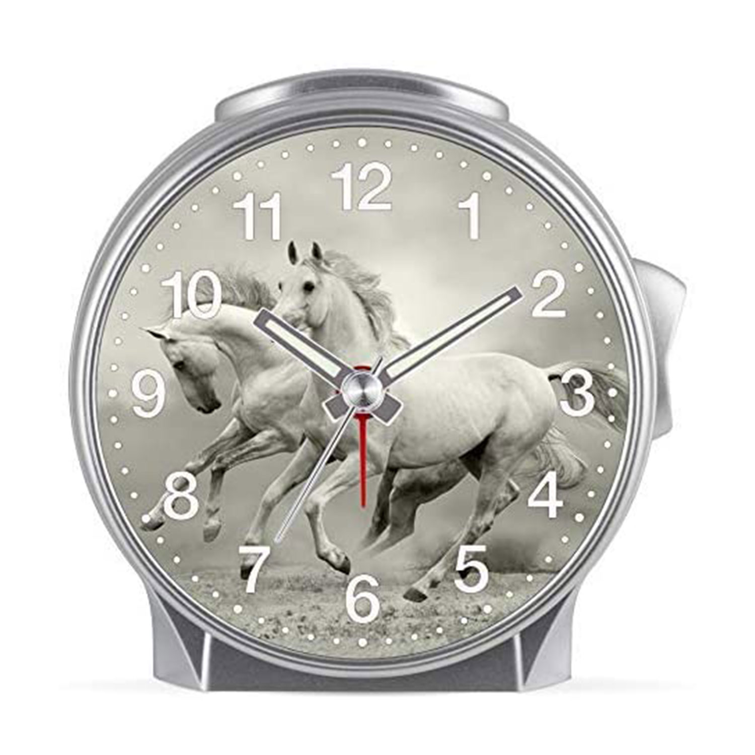 <br />Das mit großen arabischen Ziffern versehene, von einem beeindruckenden Pferde-Motiv geprägte Zifferblatt zeugt von einer kindgerechten Optik. Darüber hinaus verhindert eine schleichende Sekunde ein unliebsames Tick-Tack und ermöglicht den Kleinsten somit jederzeit einen ungestörten Schlaf. Ausgestattet ist der Kinderwecker mit einem zuverlässigen Quarzwerk.