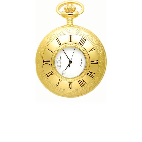 PIERRE CHATELAIN Taschenuhr – präzisions Quartzwerk (Cal. Ronda 515)- weisses Zifferblatt – aufgedruckte Klassikzahlen (schwarz)   und Minuterie (schwarz)- Stabzeiger (schwarz)- Zentralsekunde (ausgewuchtet)- Datumsanzeige (3h)- Dekorierts Gehäuse (vergoldet) mit römischen  Zahlen und Sichtglasfenster- Hesalithglas (bombiert)staubgeschützt (nicht wasserfest!)Ø: 42 mm, h: 9 mm2 Jahre GarantiePreis inkl. Etuie. Ideal auch als grosse Anhänguhr Die Uhr kann man mit einer kurzen Kette als Taschenuhr oder mit einer Umhängekette auch um den Hals tragen. ⚠️ Achtung:Taschenuhren sollten wenn möglich nicht schutzlos in der Hosentasche tragen. Schon winzigste Textilfasern können den feinen Werkmechanismus blockieren. Auch nutzt sich das beschichtete Gehäuse der Taschenuhr durch Reibung schneller ab. Daher sollte diese Uhr am besten mit einer Hülle schützen. Beim Schliessen des Deckels sollte der Drücker des Sprungdeckels betätigt werden. Das schont den Mechanismus und verhindert Kratzspuren durch die scharfe Kralle der Feder, die den Deckel geschlossen hält. Original Uhren vom Schweizer Uhrmacher Neue Taschenuhren mit original Garantie des Herstellers. Portofreie Lieferung oder Abholung in Basel. Die Uhr kann gerne vor einer Kaufentscheidung besichtigt, und auch vor Ort in Basel abgeholt werden. Wir empfehlen dazu eine Taschenuhrkette aus unserem Zubehör Angebot.