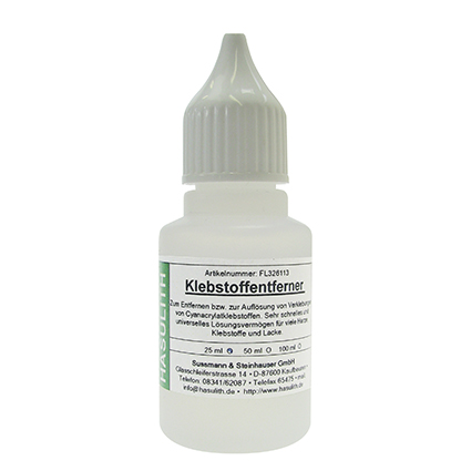 Der Klebstoffentferner ist eine spezielle Verdünnung zum Entfernen von Sekundenkleberflecken. Auch viele andere Klebstoffe und Lackierungen werden auf- oder abgelöst. Klebstoff-Flecken werden entfernt, Verklebungen – auch von Cyanacrylatklebstoffen (Sekundenklebern) – aufgelöst.