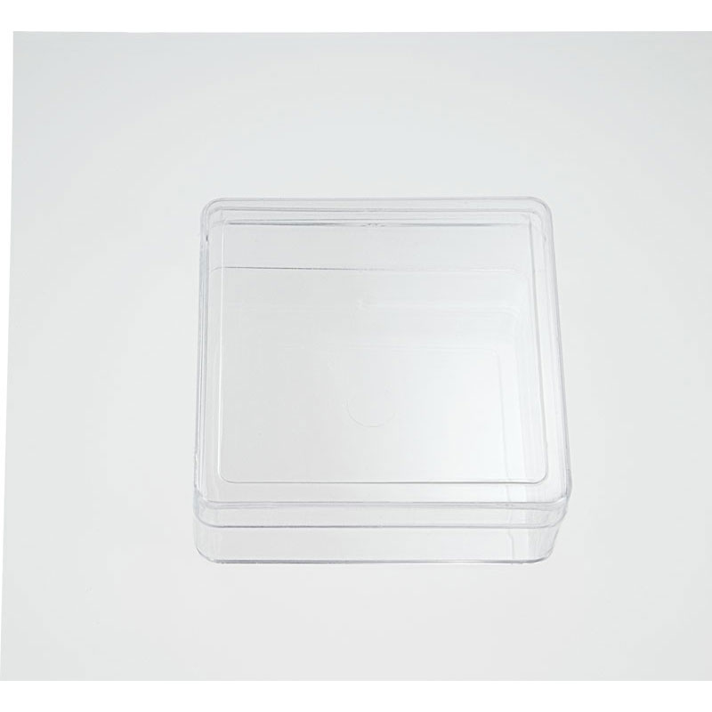 Aus glasklarem Polystyrol, mit Stülpdeckel.