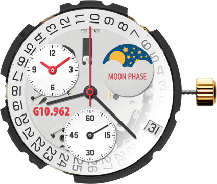 <br />Mondphasenanzeige, Koaxialzähler 60 Minuten und 12 Stunden