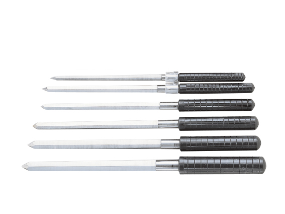 Aus Silberstahl, 5-kantig, mit geriffeltem Kunststoffgriff.