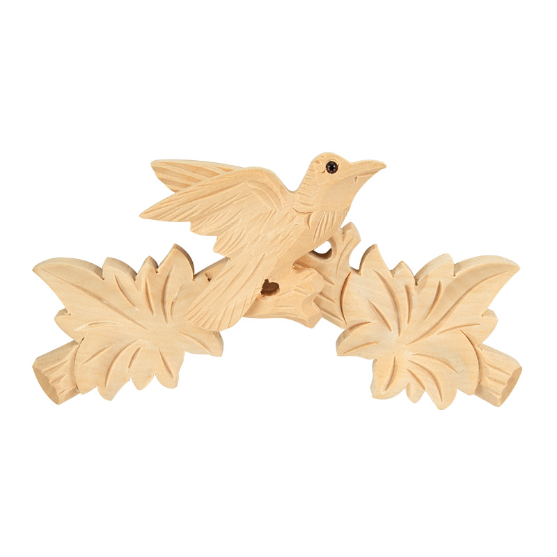 <br /><br /><br />Geschnitzt, für Kuckucksuhren. Weinlaub mit Vogel. Rohes, vorgeschliffenes Holz.