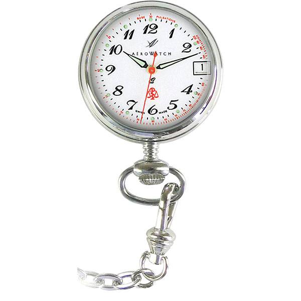 Die hochwertige Krankenschwester Quartz-Anhängeuhr von Swiss Nurse steht für Präzision und Qualität! AEROWATCH Schwesternuhr mit Datumsanzeige – Schweizer Präzisions Quartzwerk – weisses Zifferblatt mit Leuchtzahlen – weisse Datumsanzeige- schwarze Minuterie und rote Pulsometerskala (30 Herzschläge) – schwarze Leuchtzeiger (h/min) rote Zentralsekunde (ausgewuchtet) – Palladiumbeschichtetes Metallgehäuse (poliert) – gehärtetes Mineralglas (bombiert) – Zwiebelkrone – Pressboden (ohne Dekor) Am Ring des beweglichen Kronenbügel lässt sich sowohl die mitgelieferte Broschenkette, aber auch eine Umhängekette oder eine Stoffkordel montieren. 3 ATM Wassergeschützt (nicht zum Schwimmen geeignet 32×19 mm, h: 10.5 mm, ca 23g2 Jahre GarantiePreis inkl. Broschenkette und Etuie ⚕️ Schwesternuhren werden vor allem vom Pflegepersonal in Spitälern und Kliniken oder von Helferinnen in Arztpraxen verwendet. Aus Hygienegründen oder um Patienten nicht zu verletzen, dürfen sie oft keine Uhr am Handgelenk tragen, sondern befestigen diese an einer kurzen Kette an der Arbeitskleidung. Diese Anhängeruhren sind für den täglichen, professionellen Gebrauch geeignet. Aerowatch Uhren Zuverlässige Qualitätsuhren einer Schweizer Traditionsmarke. Aerowatch kreiert seit 1910 Uhren und ist ein unabhängiges Familienunternehmen. Für die Marke Aero Watch gehört eine sorgfältige Detailpflege untrennbar zum eigenen Verständnis von moderner Uhrmacherei, der sie einen zeitlosen und dennoch unverwechselbaren Stil verleihen will. Original Uhren mit Garantie vom Schweizer Uhrmacher Neue Umhängeuhr mit Garantie des Herstellers. Die Uhr kann auf Wunsch gerne nach Vereinbarung besichtigt und auch vor Ort in Basel abgeholt werden. Portofreie Lieferung. Sie können alle Aero Uhren bei uns bestellen. Gerne machen wir Ihnen ein Angebot! Weitere Infos über Schwesternuhren » in unserem Blog