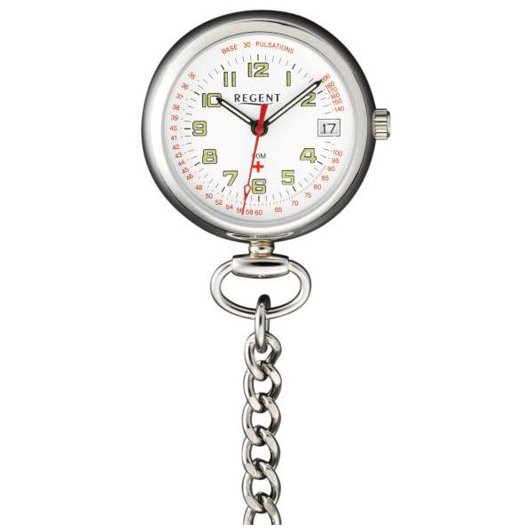 Professionelle Schwesternuhren – Präzisions Quartzwerk (CE zertifiziert) – weisses Zifferblatt mit Leuchtzahlen – aufgedruckte Minuterie – rote Pulsometereinteilung – schwarze Zeiger mit inaktiver Leuchtmasse – roter Sekundenzeiger (ausgewuchtet) – poliertes Edelstahl Gehäuse – polierter Pressboden (ohne Dekor) – kratzgeschütztes Mineralglas (flach) – griffige Zeigerstellkrone Am beweglichen Kronenbügel ist eine demontierbare Kettenbrosche montiert. Es lässt sich auch eine Taschenuhrkette oder Stoff- oder Lederkordel montieren. Ideal für alle Aerzte, Krankenschwester, Krankenpfleger, Pflegeberufe… Pulsometer: Erlaubt das rasche Ablesen des Pulses. Zuerst Stellung des Sekundenzeigers merken, 30 Pulsschläge abzählen, die vergangene Zeit ablesen und schon können Sie neben der ensprechenden Sekundeneinteilung auf der Pulsometerskala den Puls pro Minute ablesen. Spezialkonditionen ab 3 Stück 5 ATM Wasserdicht (nicht zum Schwimmen geeignet) Ø: 31 mm, h: 9 mm, 2 Jahre Garantie Preis inkl. Box und Broschenkette Natürlich auch als Anhängeuhr mit Kette tragbar (nicht im Preis inbegriffen) Regent Nurse Uhren in der Schweiz Regent, bekannt für qulitäts Umhänge- und Taschenuhren, wurde 1983 als Marke für den Uhrenfachhandel gegründet und ist heute Garant für solide Qualitätsuhren zu erschwinglichen Preisen. Mit mehr als 15 Millionen Uhren, die in 30 Jahren verkauft wurden, zählt der Deutsche Uhrenhersteller zu den weit verbreitetsten Uhrenmarken im deutschsprachigen Raum. ⚕️ Krankenschwesteruhren Schwesternuhren werden vor allem vom Pflegepersonal in Spitälern und Kliniken oder von Helferinnen in Arztpraxen verwendet. Aus Hygienegründen oder um Patienten nicht zu verletzen, dürfen sie oft keine Uhr am Handgelenk tragen, sondern befestigen diese an einer kurzen Kette an der Arbeitskleidung. Diese Anhängeruhren sind für den täglichen, professionellen Gebrauch geeignet. Neue Uhren mit original Garantie des Herstellers. Die Uhr kann gerne vor einer Kaufentscheidung besichtigt, und auch vor Ort in Basel abgeholt werden. Portofreie Lieferung. Wir sind offizielle Schweizer Konzessionäre. Sie können alle Modelle auch telefonisch bestellen. Gerne machen wir Ihnen ein Angebot! Weitere Infos über Schwesternuhren » in unserem Blog