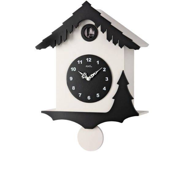 Moderne, weisse Kuckucksuhr im Winterlook – Quartz Pendeluhrwerk mit Kuckucksruf  (mit Echo) und Vogelgezwitscher- einfaches Pressholzgehäuse (weiss+schwarz koloriert)- schwarzes Zifferblatt mit römischen Zahlen- weisse Louis XVI Zeiger- beweglicher Kuckuck (12h)- weisse PendellinseDiese Kuckucksuhr ruft jede Stunde. Der Vogel kommt aus der Öffnung, pfeift zuerst kurz und ruft kuckuck. Das Pfeifen des Kuckucks lässt sich auch abstellen!Auf dem Zifferblatt über der 12 ist ein Lichtsensor angebracht, den den Kuckucksruf in der Dunkelheit automatisch ausschaltet.Einfache MontageNur für den Innengebrauch!h: 34 cm, b: 30cm, t: 10cm, ca. 2 Kg2 Jahre GarantiePreis inkl. Kartonbox, Gebrauchsanweisung (De,En,Fr,Sp,It), Batterien (3x LR14, 3V) Moderne Kuckucksuhr mit Garantie vom Schweizer Uhrmacher Neue AMS Wanduhr mit Garantie des Herstellers. Auch diese Uhr kann gerne vor einer Kaufentscheidung besichtigt, und auch vor Ort in Basel abgeholt werden. Portofreie Lieferung