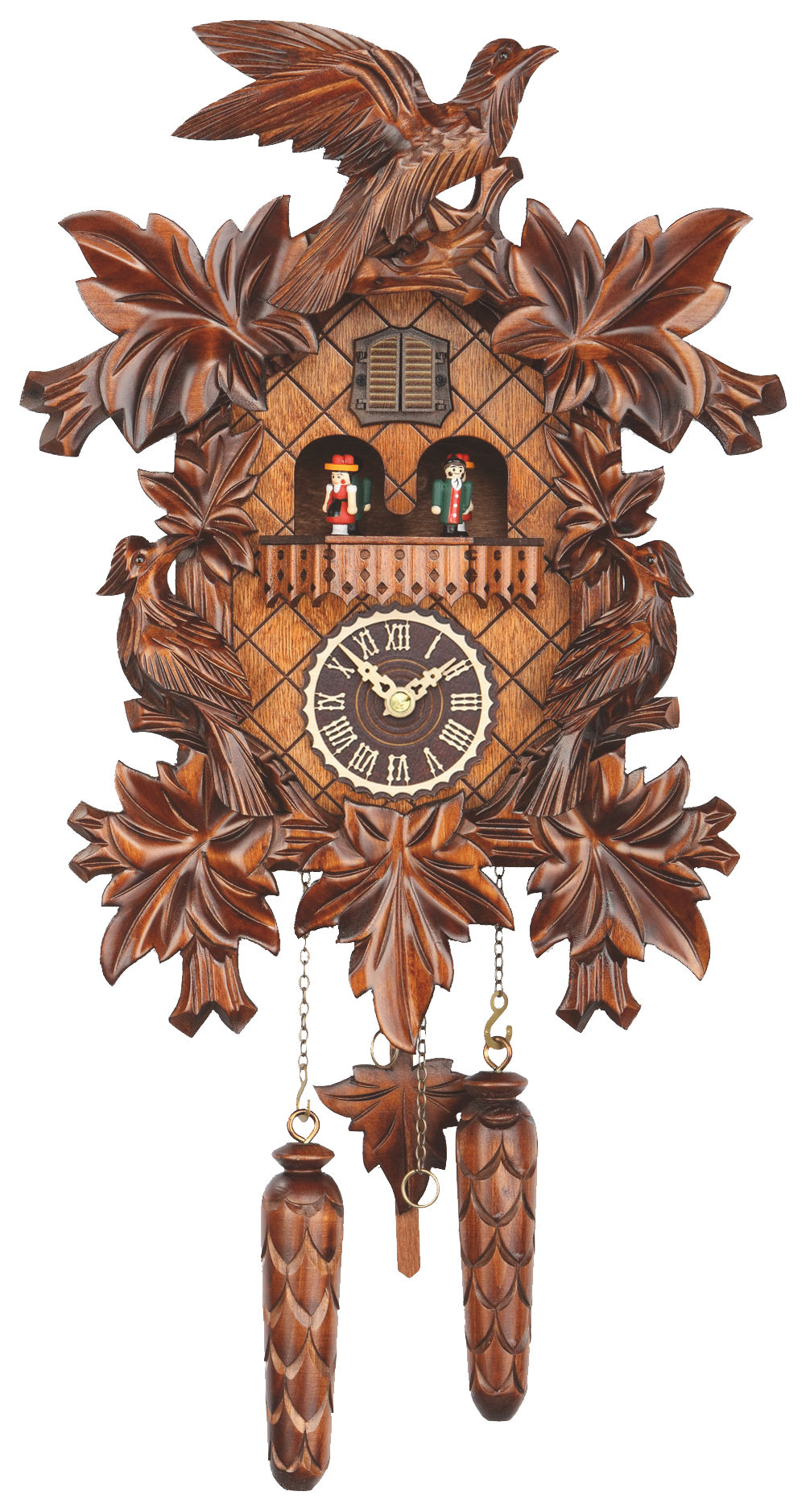 Aufwändig geschnitzt, imposant in der Erscheinung! Mit drehenden Tänzern, automatischer Nachtabschaltung, 12 Melodien, präzises Quarzwerk, Holzzifferblatt und Holzzeigern.