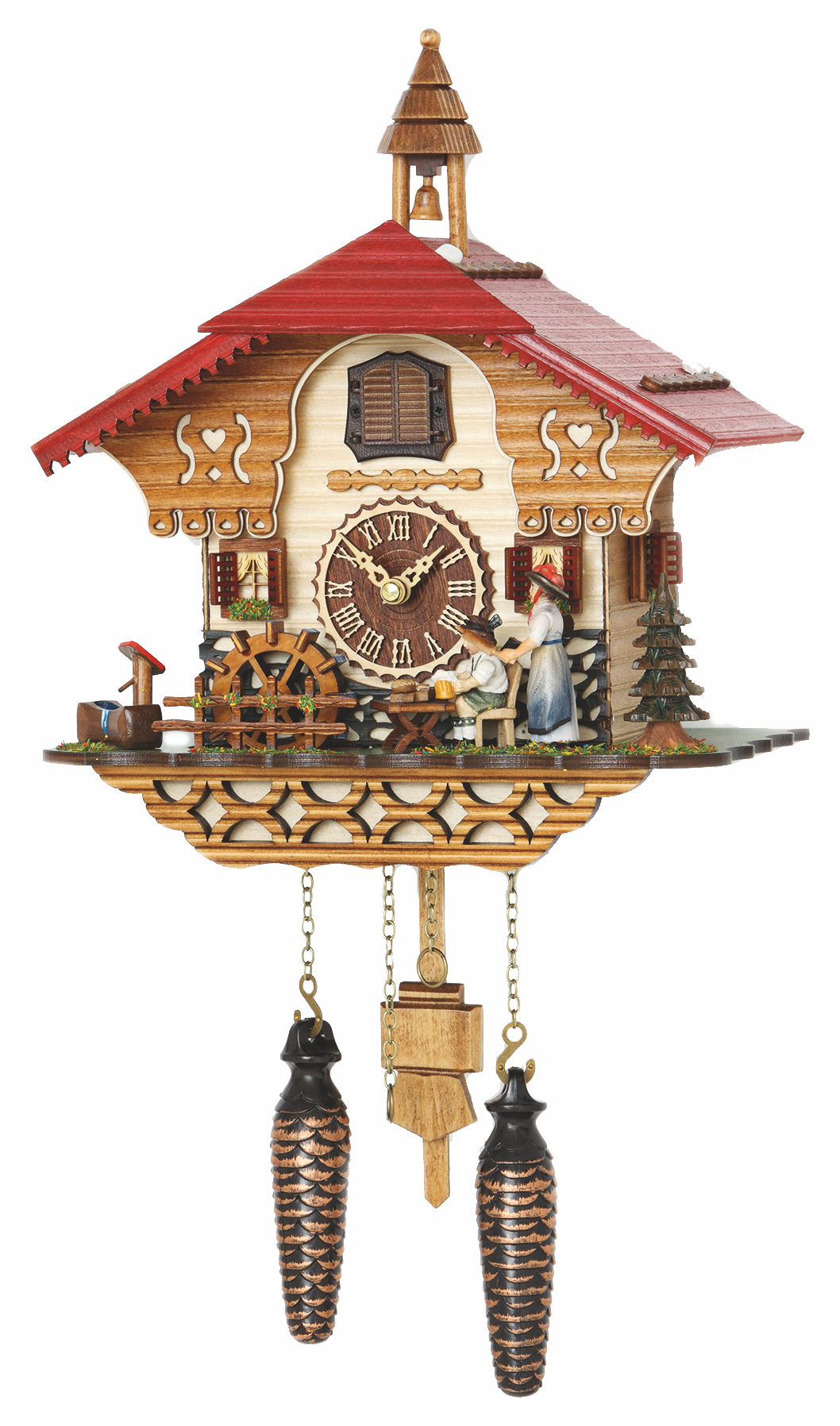 Quarzwerk mit automatischer Nachtabschaltung, spielt 12 Melodien, bewegliche Frau mit Nudelholz sowie ein drehendes Mühlrad.