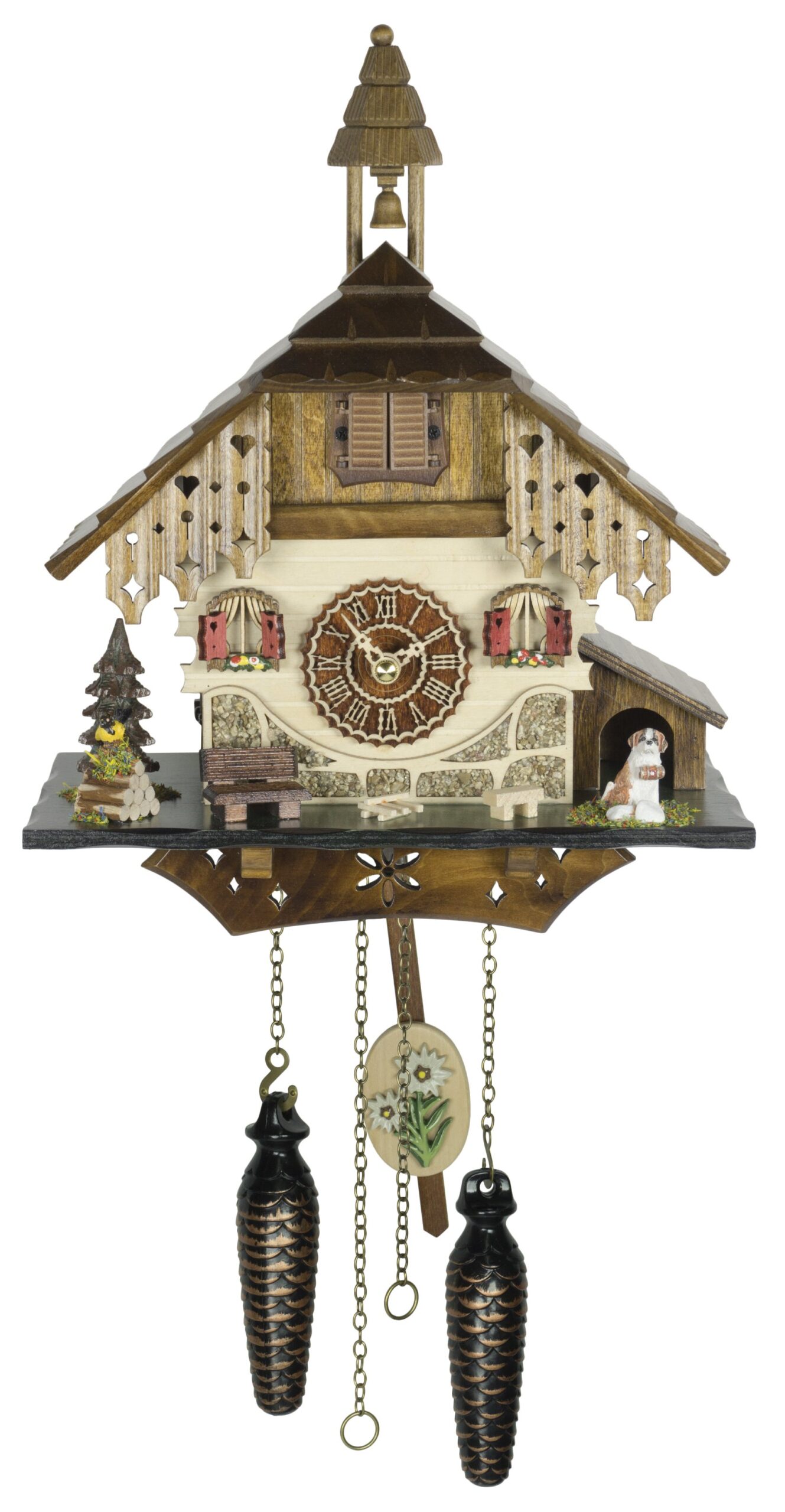 Aus Holz handgefertigt, liebevoll detailliert und bemalt im Schwarzwald. Quarzwerk mit mit 12 Melodien, beweglicher Holzhacker und drehendes Mühlrad, automatische Nachtabschaltung, Höhe 31cm..