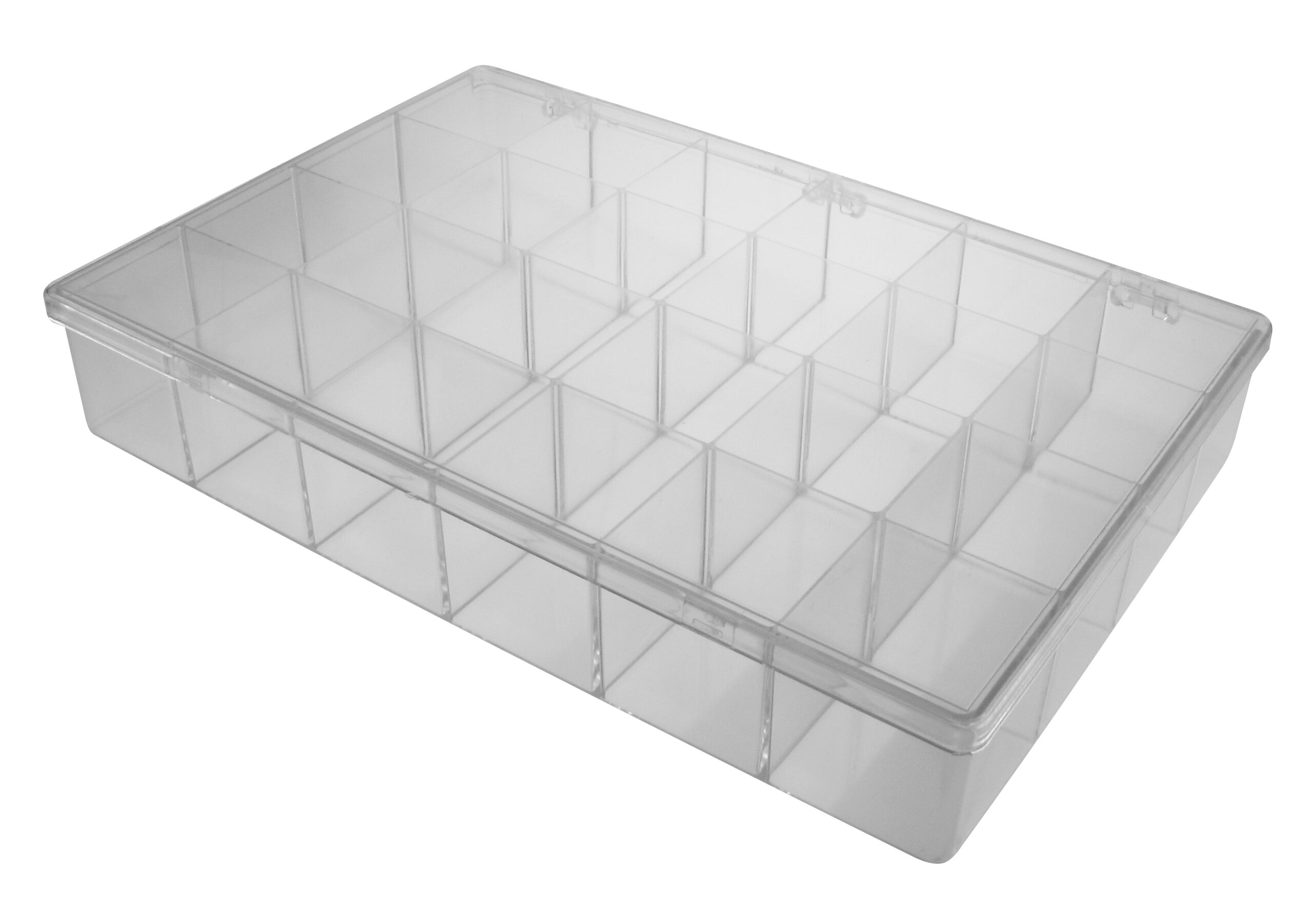 Mit Scharnierdeckel und 24 Fächern, je 52 x 52 x 52 mm.